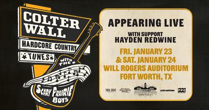 Colter Wall’s shows at the Auditorium Entertainment Series will follow his highly successful 2025 tour, spanning across North America with stops in Las Vegas, Seattle, Chicago, Calgary and more. Produced by Live Nation and FPC Live, the Fort Worth shows are part of a three-city, six-date run that includes Friday Jan. 16 at ACL Live at the Moody Theater in Austin before continuing with shows in Houston and Fort Worth. Special guest Hayden Redwine will join Colter on the January 2026 dates.