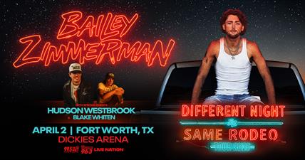 Today, multi-platinum country superstar Bailey Zimmerman is thrilled to announce his 2026 Different Night Same Rodeo Tour to 30+ venues including a stop to Dickies Arena in Fort Worth on Thursday, April 2. Following his sold-out headline trek for his New To Country Tour, Zimmerman will continue to electrify audiences with his dynamic live show across the US and Canada, promoted by Live Nation and featuring support from Hudson Westbrook and Blake Whiten.