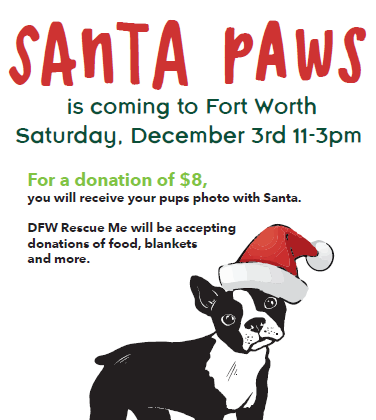 Santa is coming to town for all the good pups! For a donation of $8, you can get a photo of your pup with Santa! All donations will go to DFW Rescue Me. No sign up required. http://www.dfwrescueme.org/
